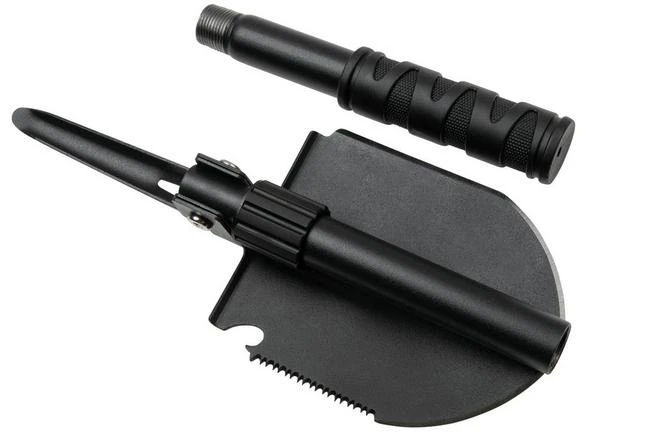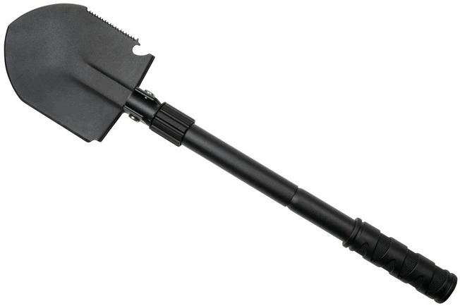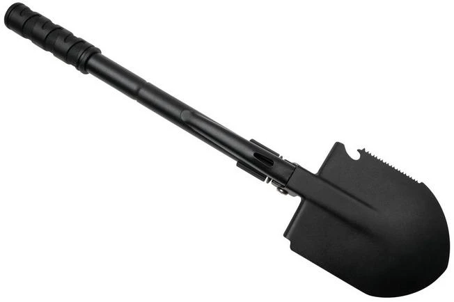 The Off Grid Tools Manganese Camping Shovel is a compact folding shovel. Ideal for camping trips. The shovel has a sharp cutting edge, a serrated cutting edge, a pickaxe and a bottle opener. Because you deserve a beer after all that digging!